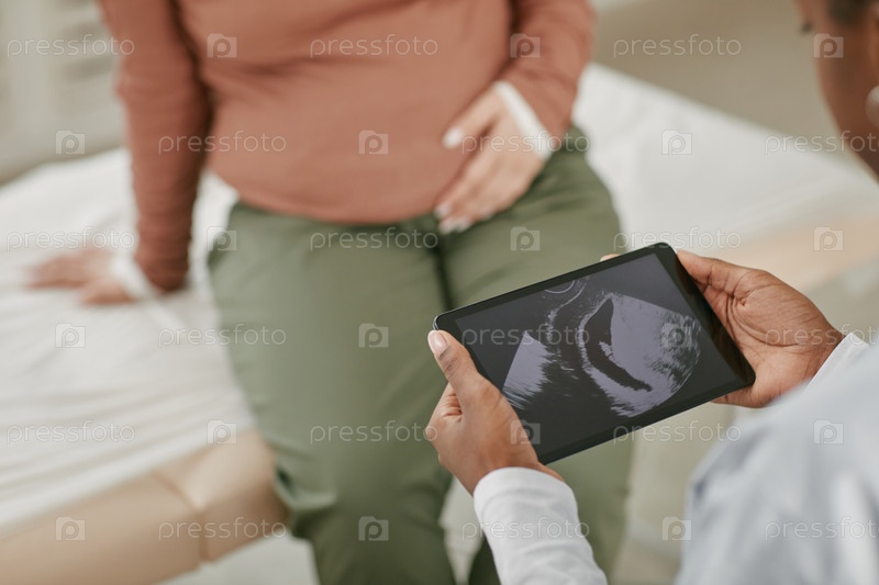 Беременная азиатская женщина посещает пренатальный осмотр с врачом, который рассматривает ультразвук
