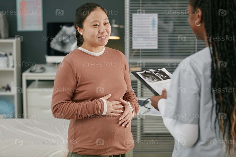 Беременная молодая взрослая азиатская женщина, посещающая консультацию по пренатальному уходу