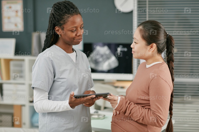 Молодая взрослая азиатская женщина посещает пренатальный осмотр с женщиной-черным врачом