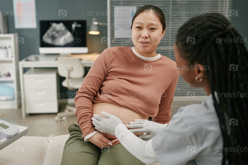 Беременная молодая взрослая азиатская женщина, проходящая обследование живота у чернокожего врача