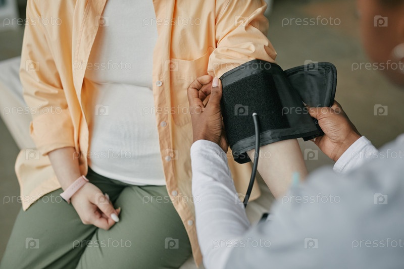 Беременная молодая взрослая азиатская женщина имеет кровяное давление, контролируемое врачом
