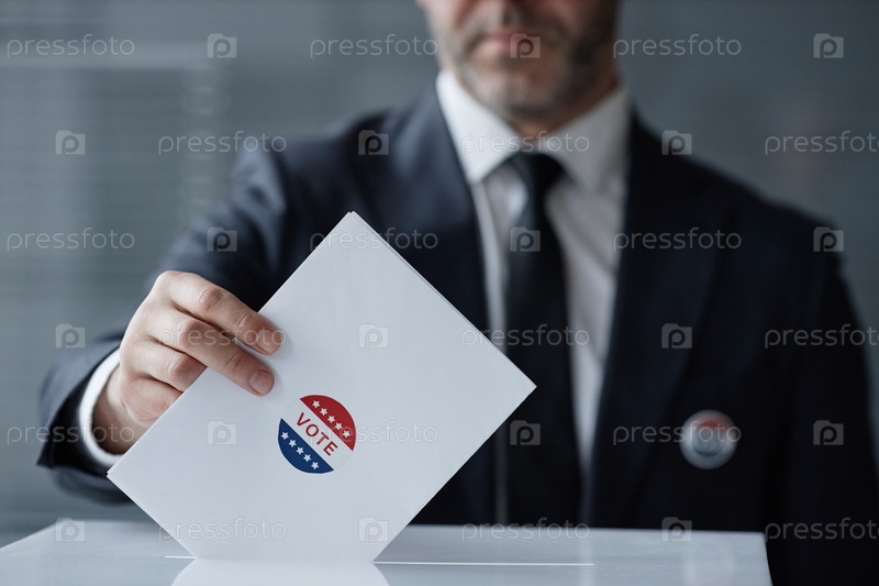 Мужской избиратель среднего возраста бросает конверт в бюллетень во время делового голосования
