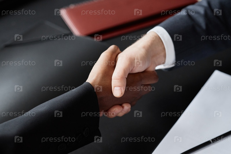 Мужчина и чернокожая женщина-бизнесмен заключают сделку с рукопожатием в помещении