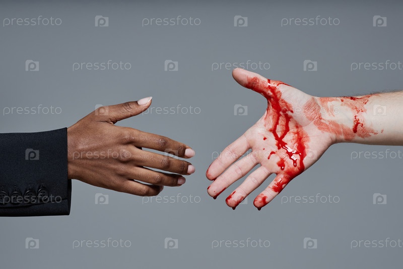 Мужчина с кровавой рукой достигает черной женщины в студии
