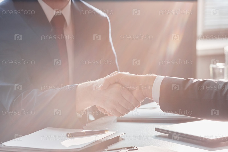Бизнесмены пожали руку коллеге во время встречи в офисе