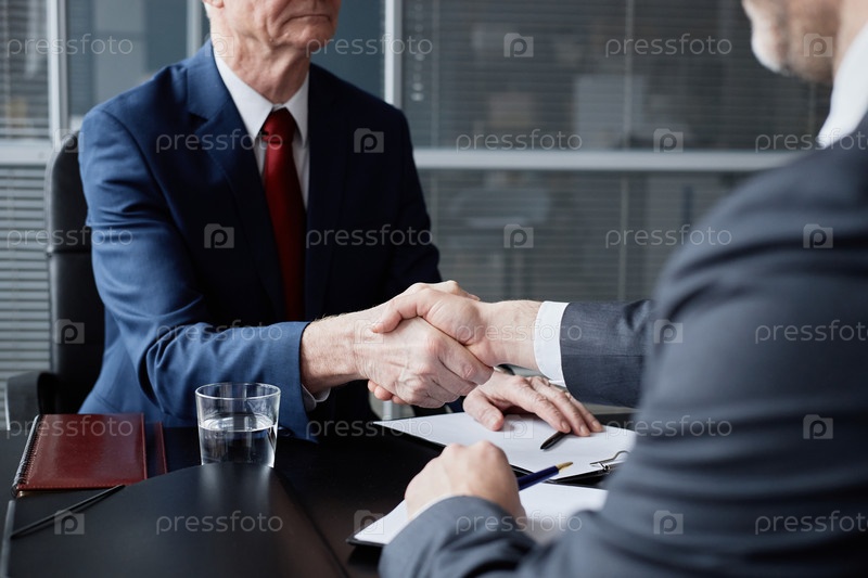 Старший бизнесмен приветствует коллегу-мужчину рукопожатием в офисе