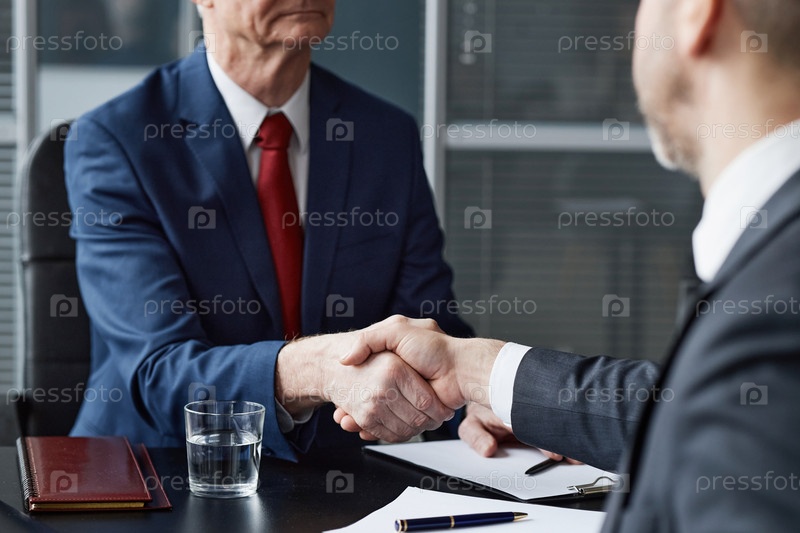 Старший мужчина пожимает руку коллеге во время деловой встречи
