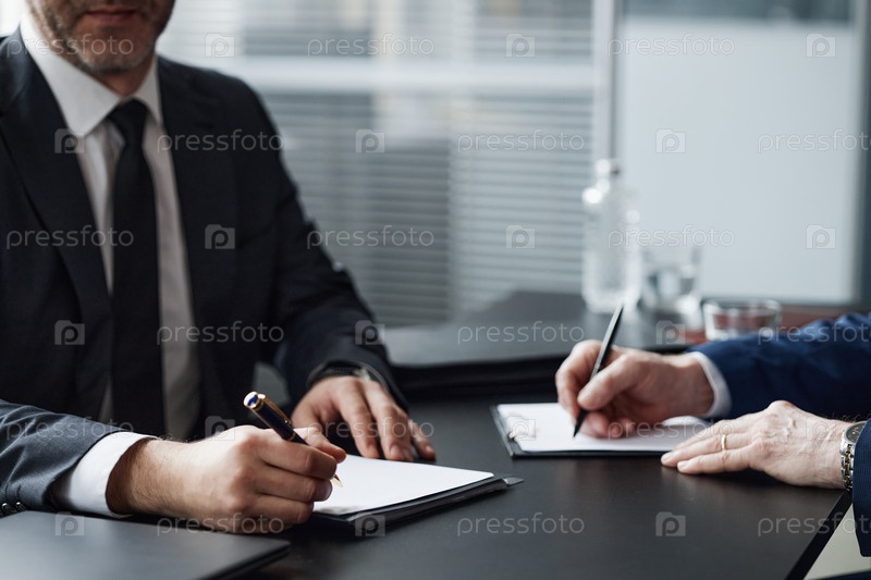 Мужчины среднего возраста, подписывающие документы во время деловой встречи на офисном столе