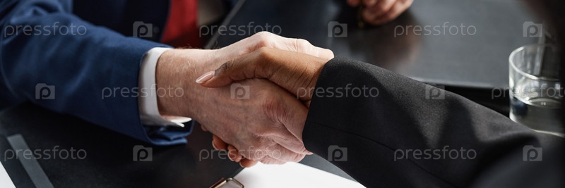 Header Image of Мужчины и чернокожие женщины-руководители, заключающие сделку по рукопожатию