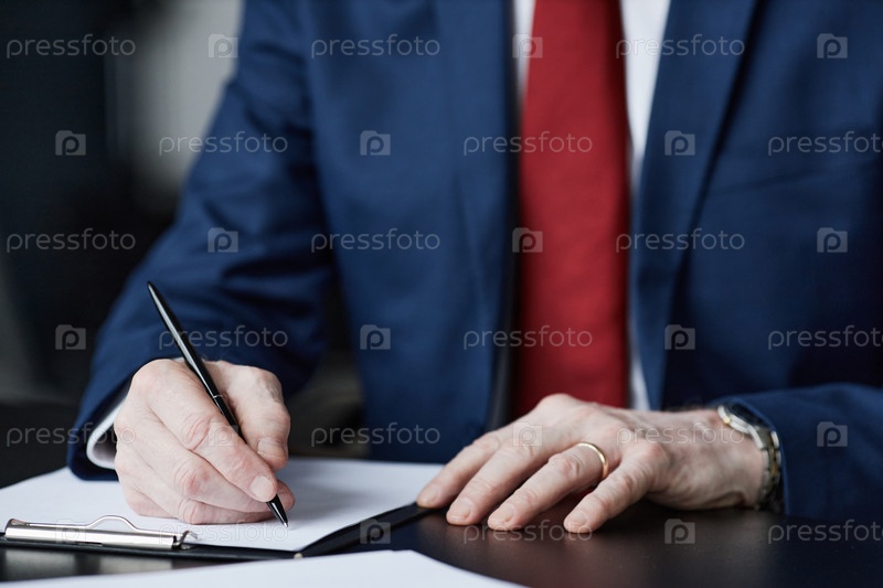 Зрелый мужчина подписывает бизнес-контракт на рабочем столе