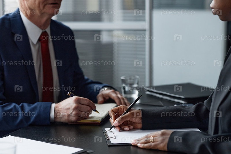 Мужчина среднего возраста и молодая чернокожая женщина подписывают деловые документы