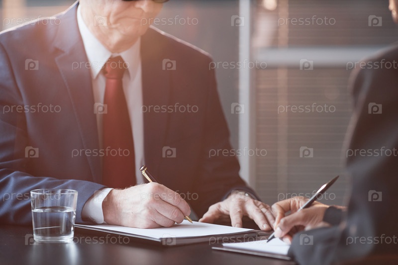 Старший мужчина подписывает документы с деловой женщиной в офисе