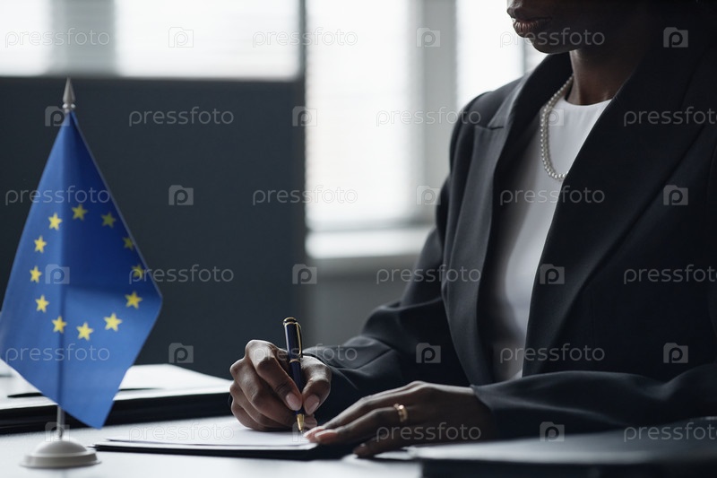 Чернокожая женщина среднего возраста подписывает документы за рабочим столом в безличной деловой обстановке