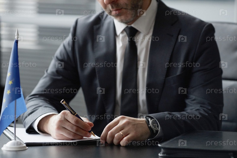 Политик среднего возраста пишет подпись на бумаге в офисе