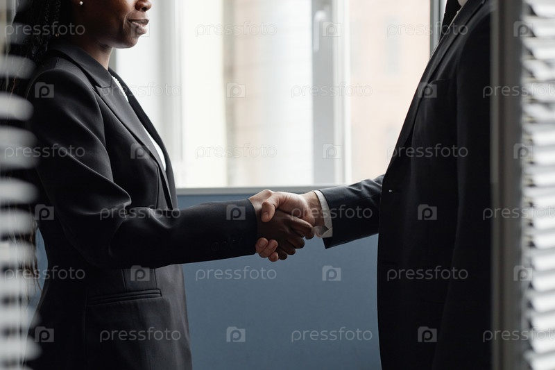 Черная молодая взрослая женщина и мужчина пожали друг другу руки в офисе