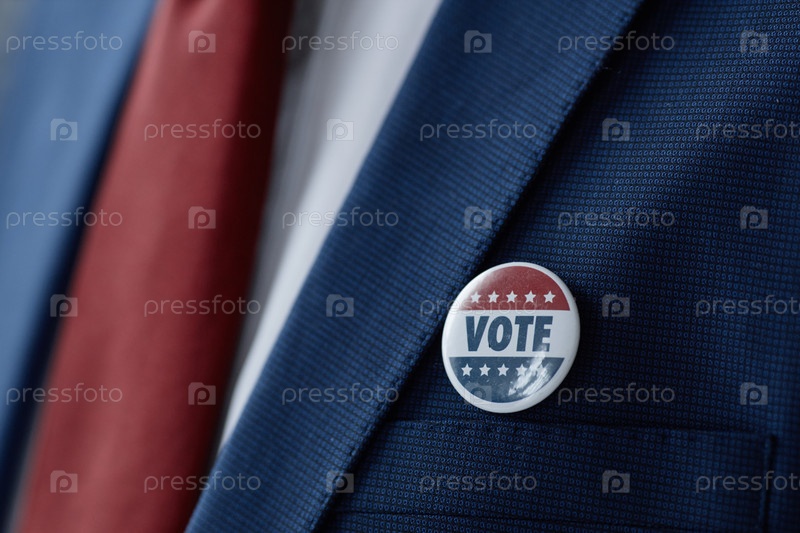 Человек в костюме с кнопкой, значок голосования наклеенный на лапель