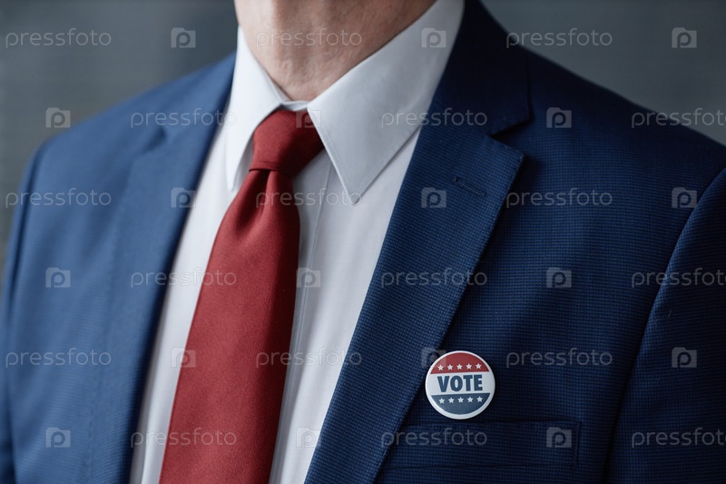 Мужчина средних лет, одетый в костюм с кнопкой голосования на рабочем месте