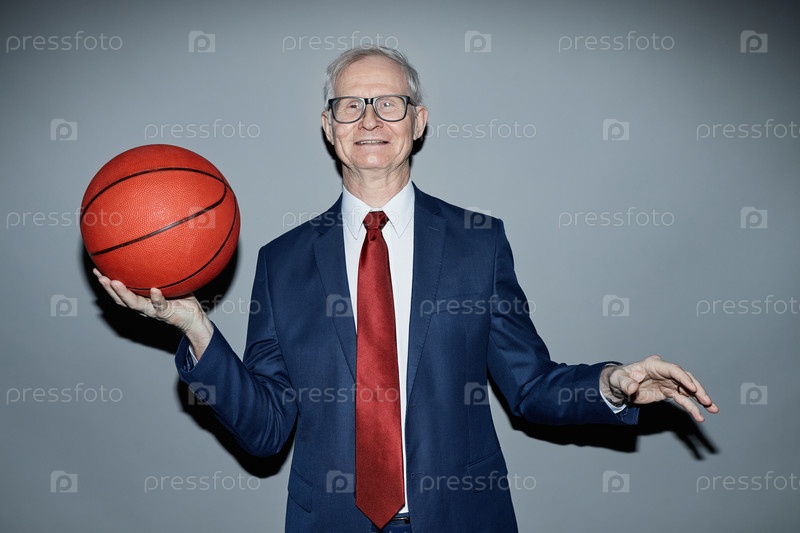 Улыбающийся старший мужчина в костюме держит баскетбол в студии