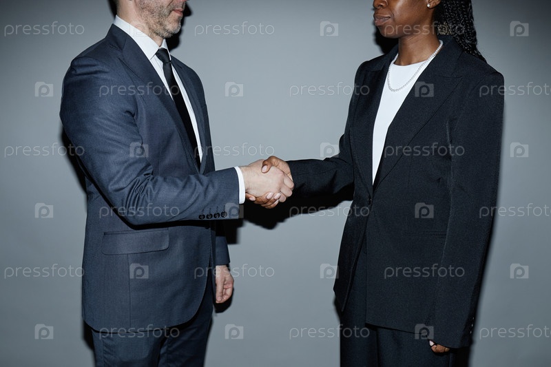 Мужчина среднего возраста и черная молодая взрослая женщина рукопожатия