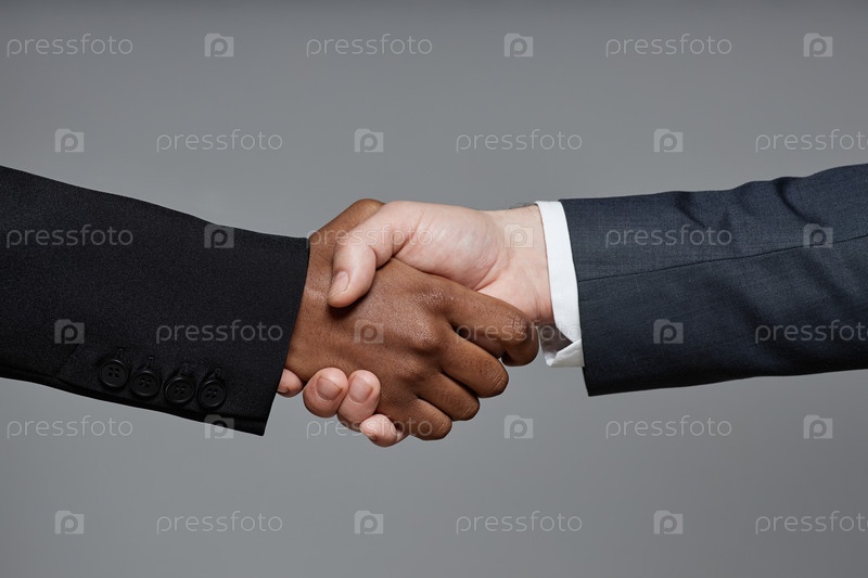 Мужчина и чернокожая женщина пожали друг другу руки, заключив деловую сделку в студии
