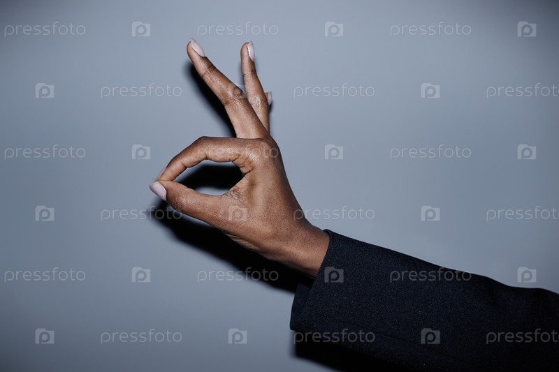 Черная женщина рукой жестикулирует Ok Sign in Grey Studio