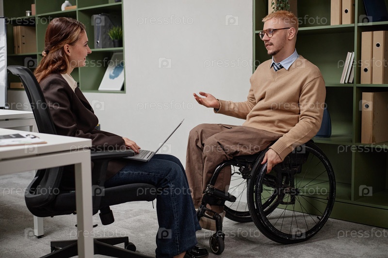 Молодой человек с инвалидностью обсуждает проект со своей коллегой по работе