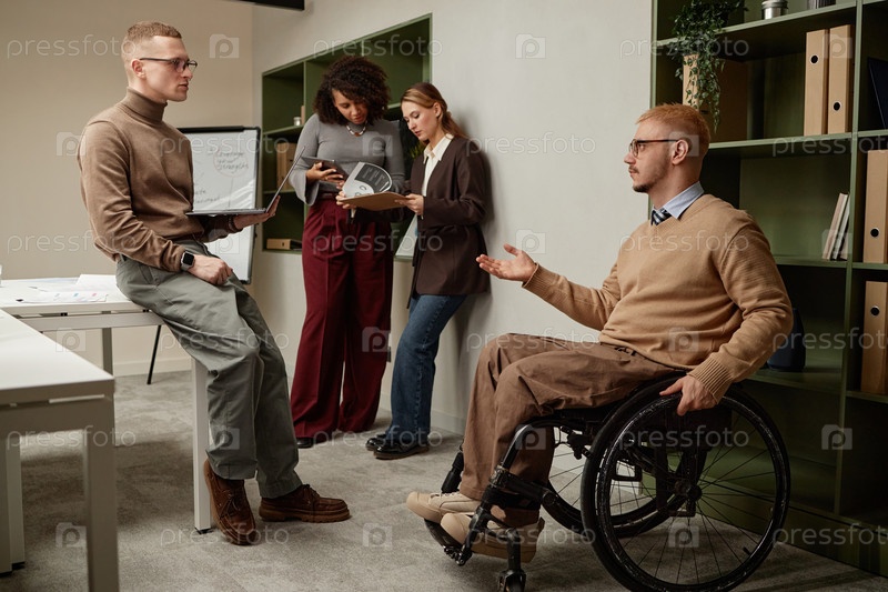 Человек с инвалидностью обсуждает проект с различными коллегами