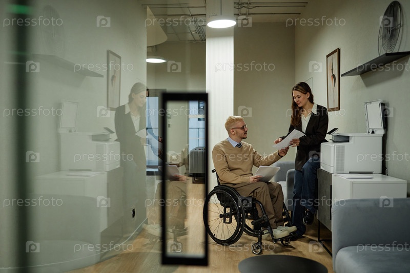 Молодой взрослый мужчина с инвалидностью обсуждает документы с молодой женщиной
