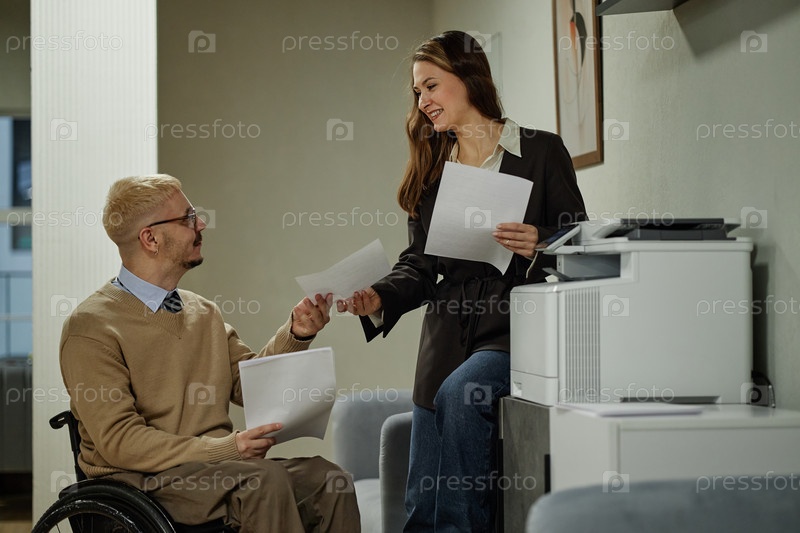 Мужчина с инвалидностью вручает документ молодой взрослой женщине