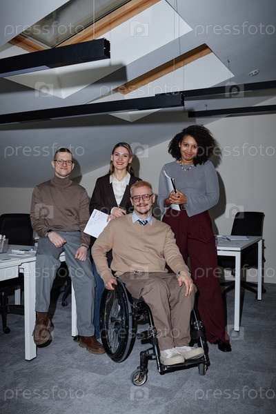 Различные молодые взрослые коллеги по работе, сотрудничающие с коллегой-инвалидом