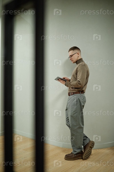 Молодой взрослый мужчина стоит на стене, используя цифровые планшеты в помещении