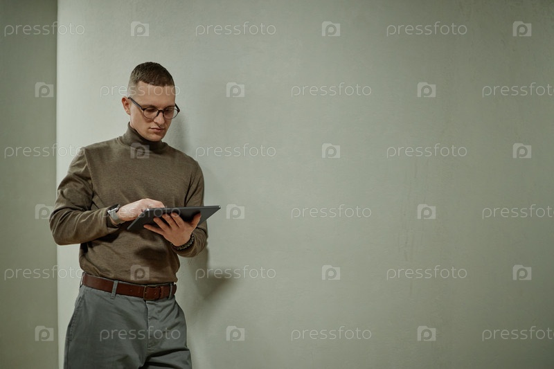 Молодой взрослый мужчина использует цифровой планшет, стоя в помещении