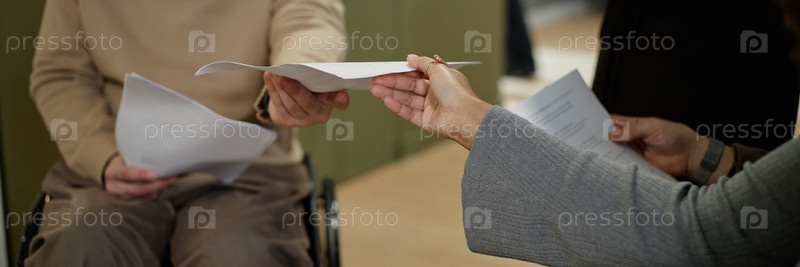 Человек с инвалидностью передает документы коллеге