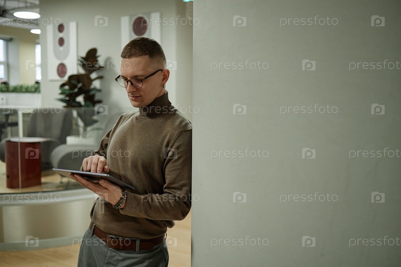 Молодой взрослый мужчина использует цифровой планшет в современной офисной обстановке