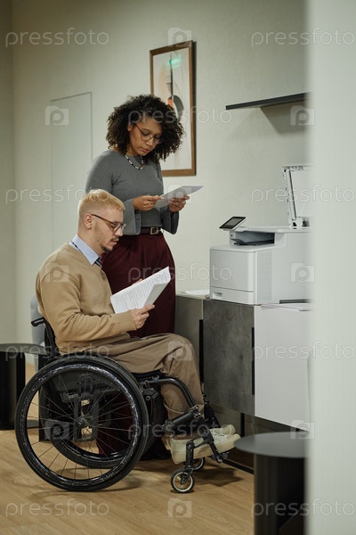 Мужчина с инвалидностью и чернокожая женщина просматривают документы на принтере