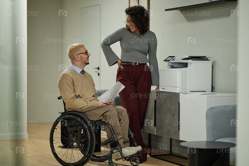 Мужчина-инвалид в инвалидном кресле разговаривает с чернокожей женщиной на работе