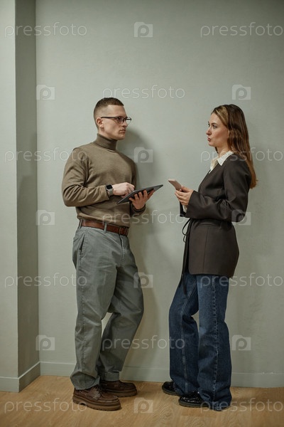 Молодой мужчина и женщина обсуждают проект с использованием планшетов