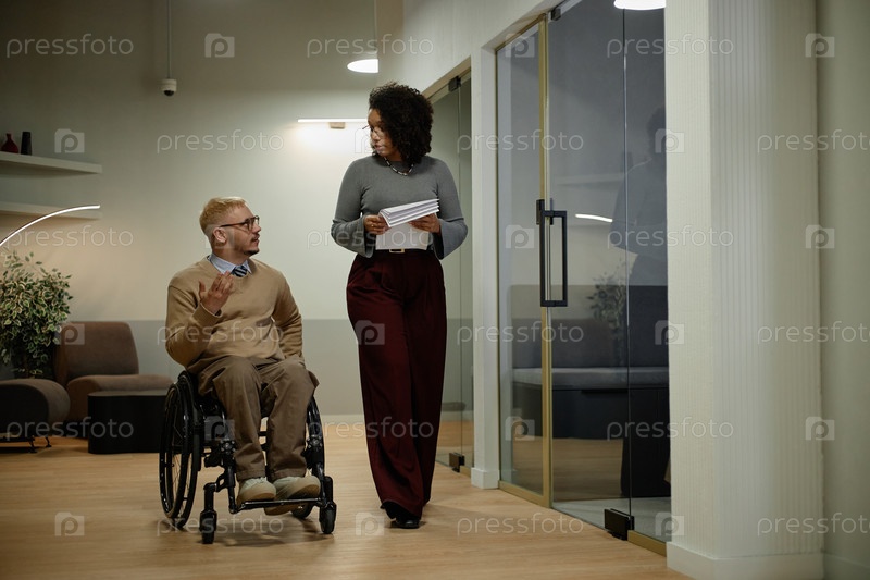 Молодой взрослый мужчина с инвалидностью разговаривает с чернокожей женщиной