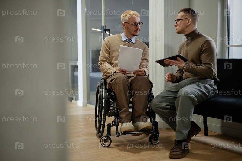 Молодой взрослый мужчина с инвалидностью обсуждает документы со своим коллегой