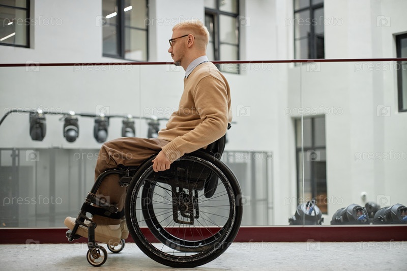 Молодой взрослый мужчина с инвалидностью, использующий коляску в помещении