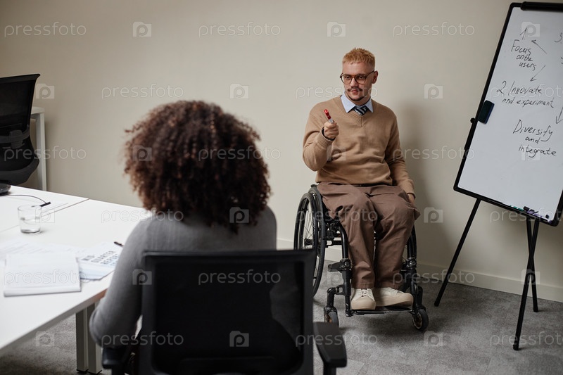 Молодой взрослый мужчина с инвалидностью ведущий бизнес-презентация