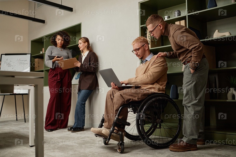 Молодой взрослый мужчина с инвалидностью использует ноутбук во время офисной встречи