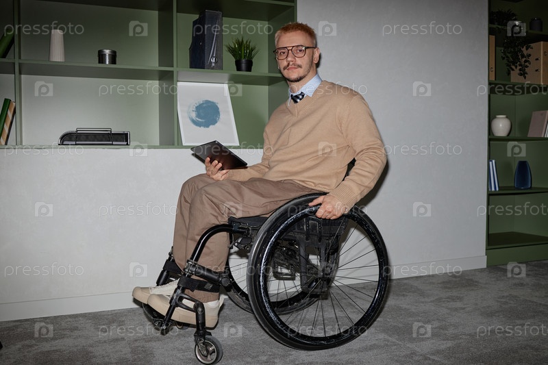 Портрет молодого взрослого мужчины с инвалидностью, использующего цифровой планшет
