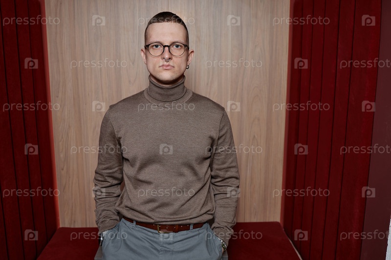 Портрет молодого взрослого мужчины, стоящего в помещении и смотрящего на камеру