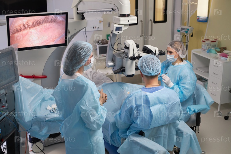 Группа хирургов, выполняющих операцию на глазах в современной операционной