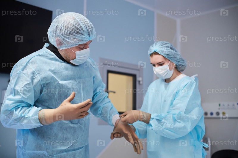 Молодая женщина помогает мужчине среднего возраста, носящему хирургические перчатки