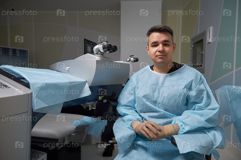Портрет мужчины, сидящего в операционной комнате и носящего скраб