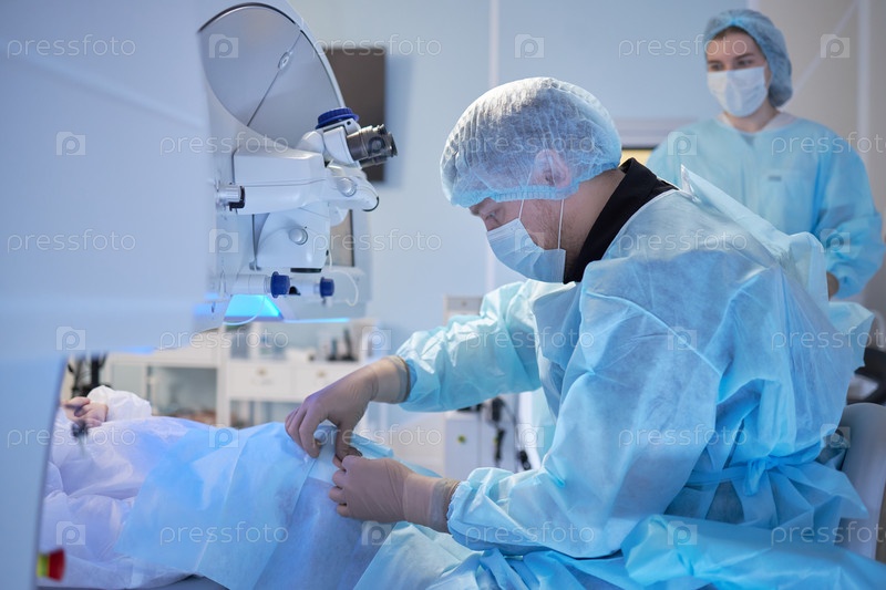 Хирург, выполняющий операцию на пациенте-мужчине в современной операционной