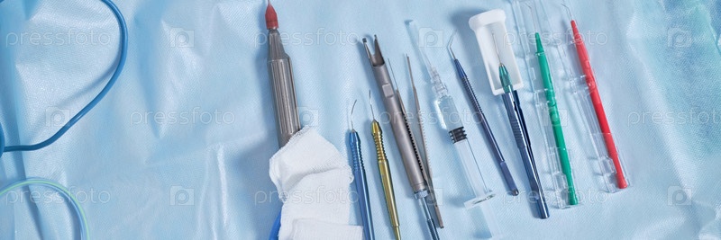 Различные хирургические инструменты, аккуратно расположенные на голубых шторах в операционной