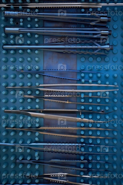 Стерильные хирургические инструменты расположены на подносе в современной операционной